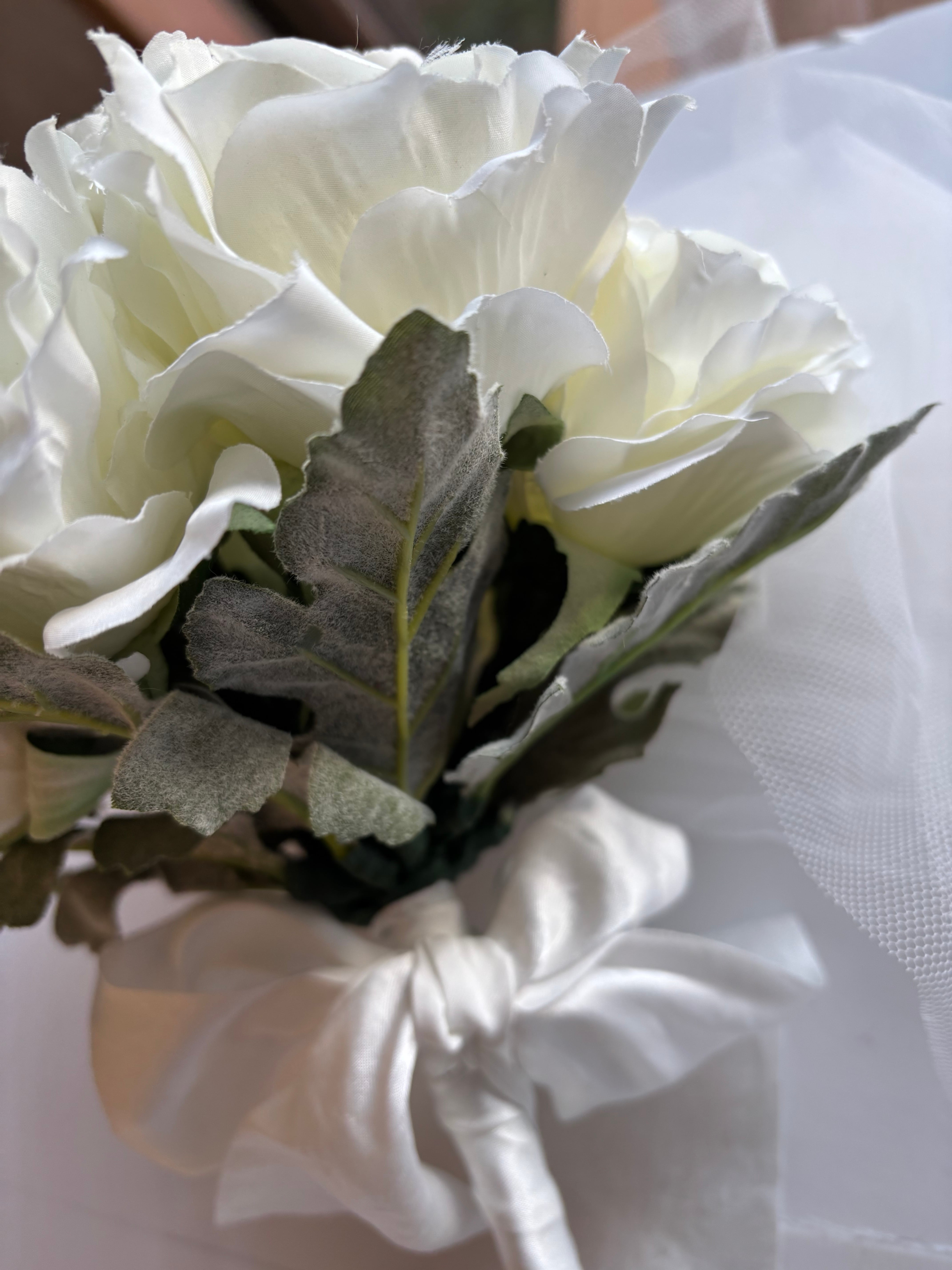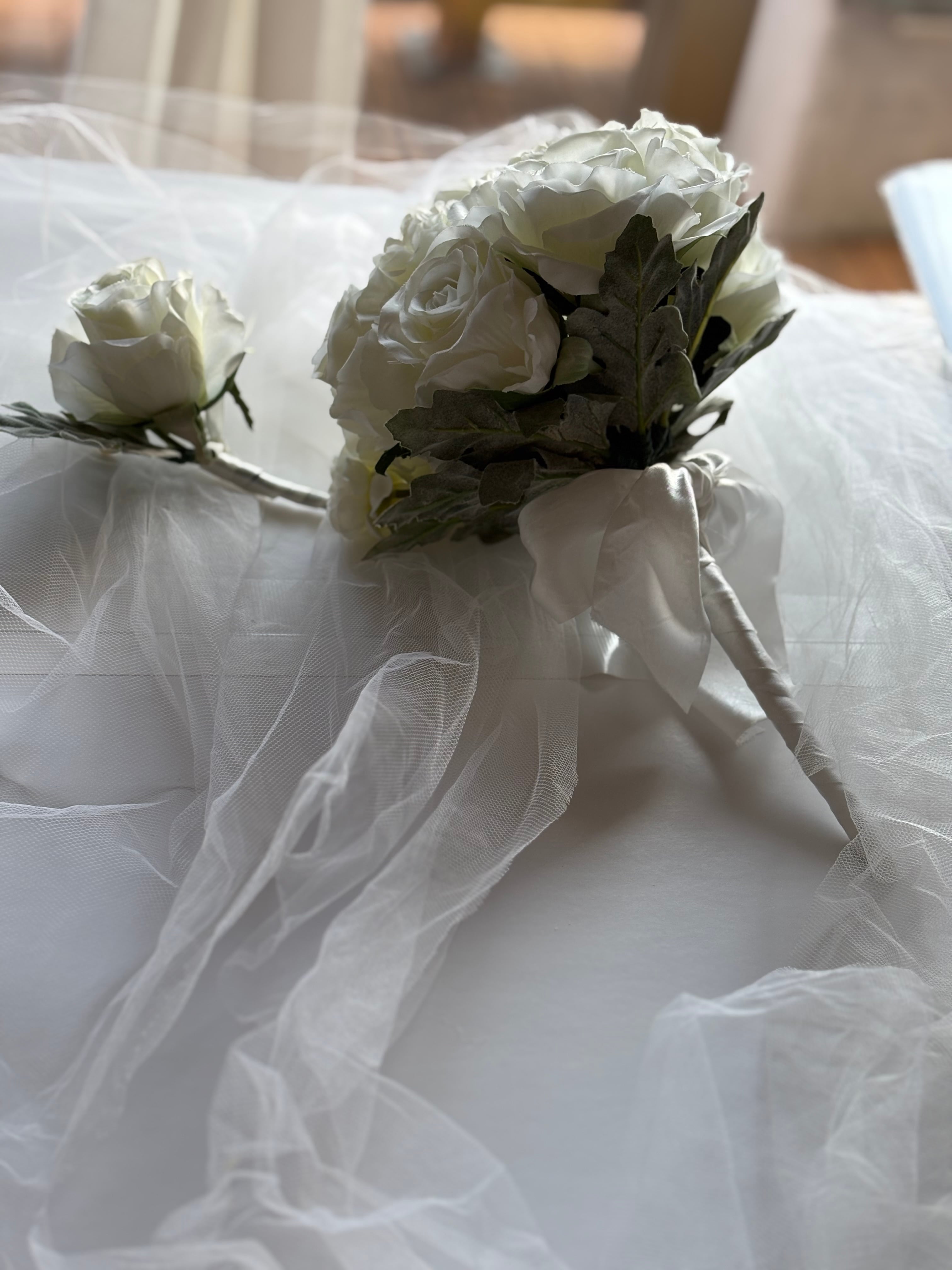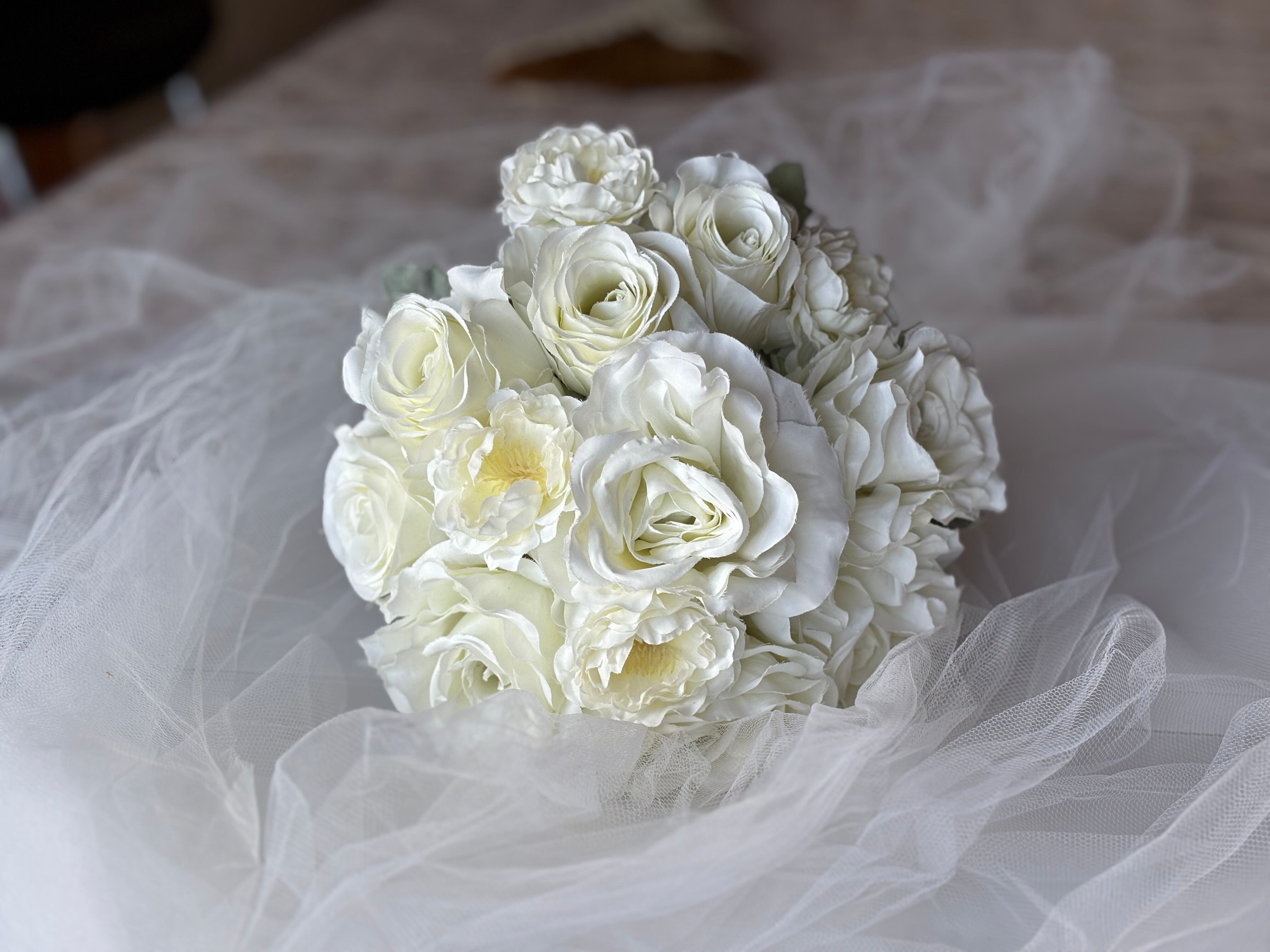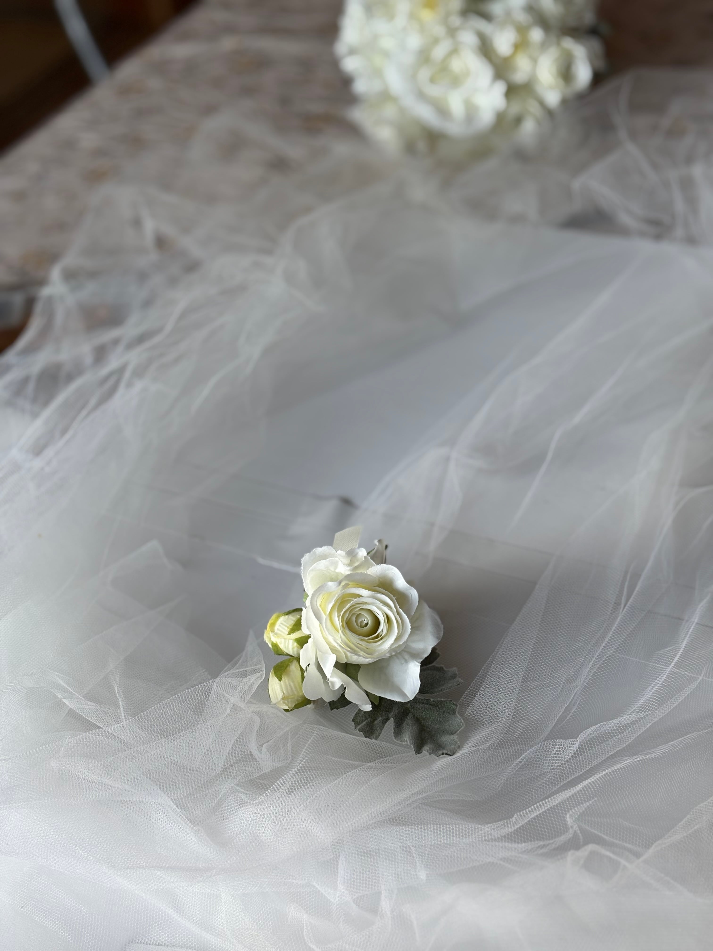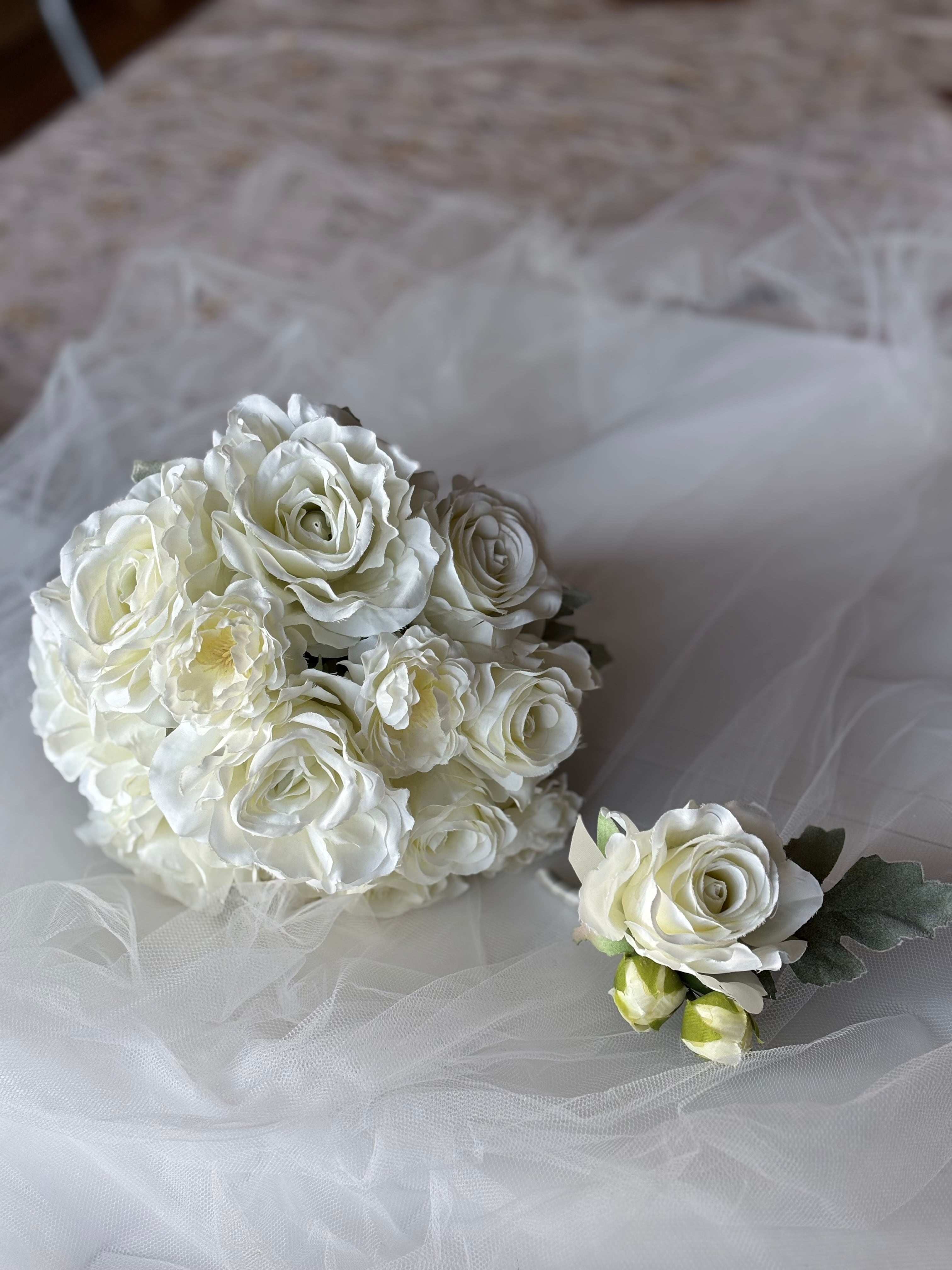 お写真の様にフェイクの薔薇とラナンキュラスだけを使用、おリボンはサテンにしたので、とても美しく感じます。